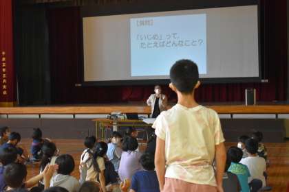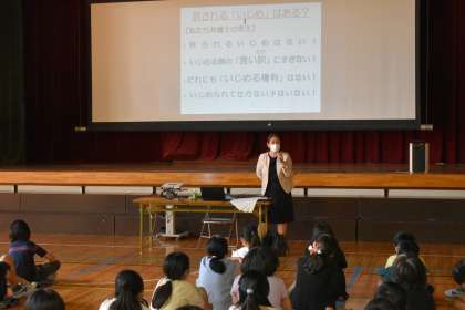 今年も弁護士の方を講師にお迎えし、6年法教育の授業「いじめ予防」を実施しました。弁護士の先生は、「いじめって例えばどんなこと?」「人権を守るってどういうこと?」「許されるいじめはある?」「いじめる人、いじめられる人、感じ方は同じかな?」と子どもたちに様々な問いを投げ掛けました。すると、子どもたちも、自分の率直な考えをすすんで話していました。授業後半では、いじめでなくなられたお子さんの遺書を読み、心をコップに例えるとその大きさは人によって違うこと、いじめがいかに人の心を傷付けるかを伝えてくださいました。最後に、いじめでみんなが悲しい思いをしないために一人一人ができることをドラえもんの登場人物から考えさせていました。ぜひご家庭でも話題にしてください。
