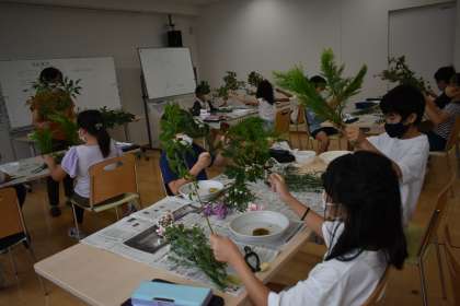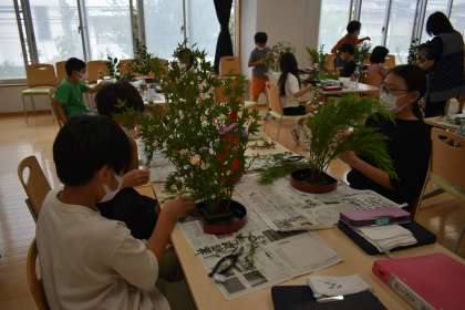 花の生け方の指導を伺いながら、はさみで花材を切ったり、花や枝を剣山にさしたりして華道に挑戦。花を生ける角度や枝の長さなどの説明では、算数で学習したことを生かすことができました。