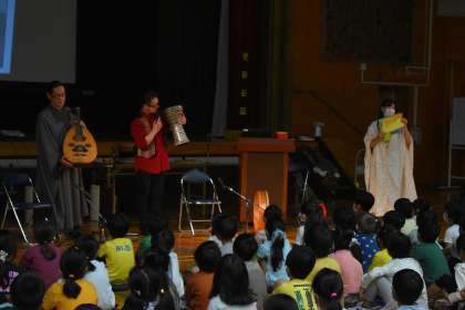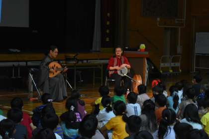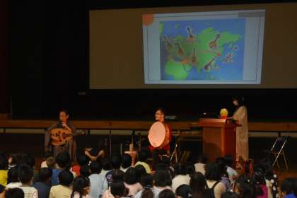 世界的ウード奏者 常味裕司氏とパーカッション奏者 立岩潤三氏によるアラブの音楽鑑賞教室を開催しました。司会は、音楽ベテラン教師 青嶋美保氏が務めました。2時間目は1・2・3年生、3時間目は4・5年生でした。すてきな演奏に加え、ウードやダブルブッカ、レク、タールなどの楽器の紹介やアラブがどこにあるのか、どんな国なのかを教えていただきました。