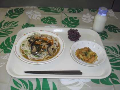 今日の給食[9月12日]『五目冷しうどん・かきあげ・デラウエア(ぶどう)・牛乳』