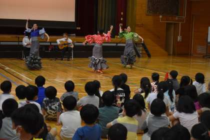いよいよ体験。12拍子のリズムや「パルマ」手の打ち方を習いました。カスタネットも体験しました。そして、カスタネットを使った「セビジヤーナス」という踊りを見せていただきました。