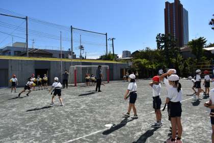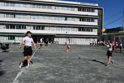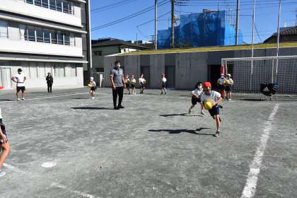リコーラグビー部の方々を講師にお招きし、ラグビー教室を実施しました。パスや防御の仕方、防御されないようにゴールを目指して走る方法等を指導していただき実際にやってみました。学習したことを生かして、ゲームを進めていきます。