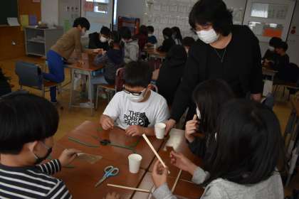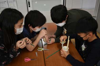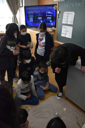 4年から6年でカリキュラム開発研究の授業を実施しています。グループワーク「たまごを守れ」では、教卓の高さから卵を落としたときに割れないように受け止める装置をグループで話し合い、実際に作って試してみるという学習をしました。話合いを進める上で、「思いつくまま」「否定はしない」「付足しアレンジOK」「友達のいいところを発見する」といったルールを確認して行いました。約束を守って、協力しながら装置を作成することができました。