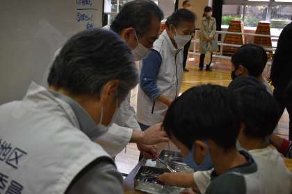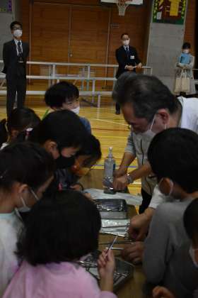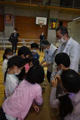 獣医さんが動物の手術や治療に使う道具を見せていただきました。子どもたちは興味津々でした。