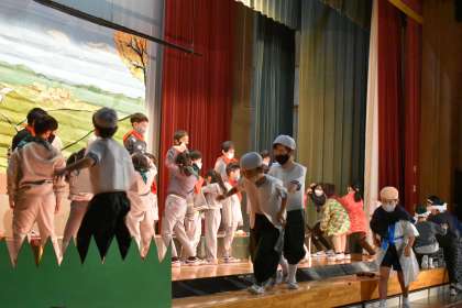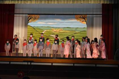 むかしむかしのお話。村のはずれに十六地蔵が並んで立っていました。そこへ、いたずらぎつねがやって来て、十六地蔵に化けて様々ないたずらをやりたい放題!困った村の人は、知恵者の和尚さんに頼んでみると・・・。2年生は初めての学芸会になりますが、この学年らしい元気とチームワークの良さを最大限に発揮して演じました。クスッと笑って笑顔でお帰りいただけていたら幸いです。
