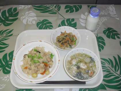 本日の給食『秋の吹き寄せごはん・肉団子入味噌汁・ごまあえ・牛乳』