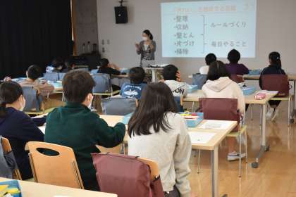 5年家庭科「お片付けの授業」 では、2013年主婦の技を競うSHUFU-1で準グランプリを受賞された丸山郁美先生を講師に招いて、アドラー心理学を取り入れた片付けの手法について学習しました。整理・収納・整頓・掃除・片付けとは何か、家族みんなが気持ちよく生活するためにルールを作ることが大切だということをを教えていただいた後、2〜3 人のグループで、物の定位置をどこにするかをカードを使って考えました。