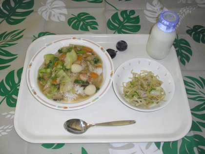 今日の給食『中華丼・白菜のサラダ・巨峰・牛乳』