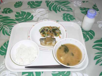 本日の給食『ごはん・さんまの塩焼き・和風サラダ・みそ汁(豆腐)・牛乳』