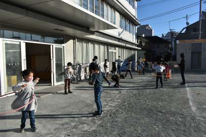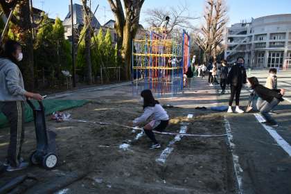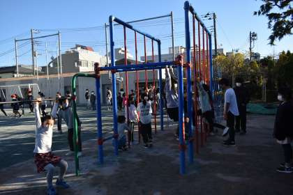 「チャレンジタイム」では、様々な運動を理解するとともに運動することに親しみをもつ、たてわり班を活用し、高学年児童のリーダーシップを養うという2つのねらいをもって、様々な運動に挑戦します。写真は、校庭で行われていた、フラフープ、砂場ジャンプ、登り棒・鉄棒です。