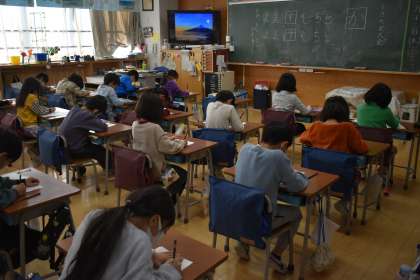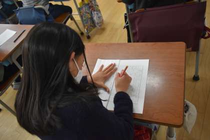 1・2年生は、各教室で書き初めを行いました。1・2年生は、硬筆なので、鉛筆で机に向かって書きました。みんな間違えないように真剣そのものでした。