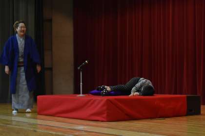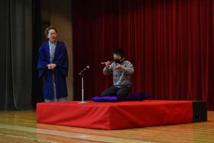 先生や子どもの代表が、扇さんが木久蔵ラーメンを食べるところを見様見真似で実演する場面もありました。大いに盛り上がりました。