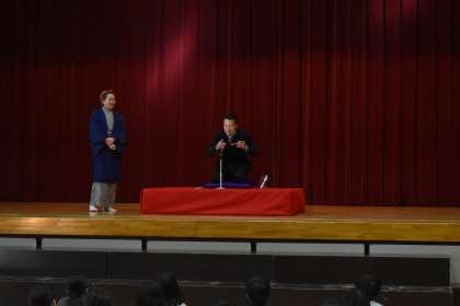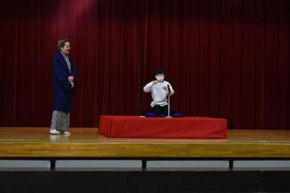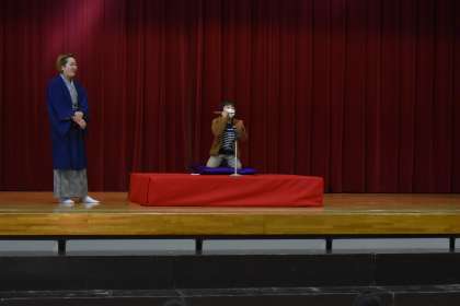 こちらも、そばやうどん、ラーメンを食べるところを先生や子どもの代表が演じました。