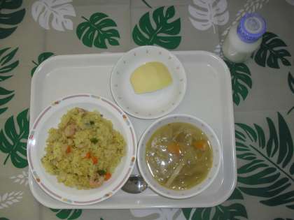 本日の給食「ジャンバラヤ・ヌードルスープ・りんご・牛乳」