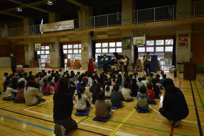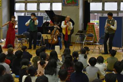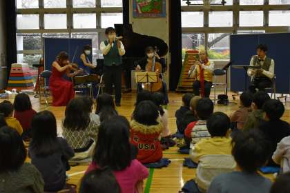 サロンコンサート協会 サロンオーケストラジャパンによるサロンコンサートをコンサートを実施いたしました。新型コロナウイルス感染予防のため、3日間かけて学年ごとに全6回行いました。ヨハン・シュトラウス二世の「ポルカ 雷鳴と稲妻」で始まりました。2曲目は、ルロイ・アンダーソンの「シンコべーテッドクロック」