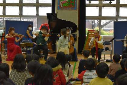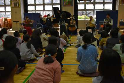 ヨハンシュトラウス二世「美しく青きドナウ」三拍子の指揮の仕方を学びました。ジャンケンと指揮は似ているというご指導は説得力がありました。また、代表児童が指揮をするのに合わせて、演奏してくださいました。ジャック・オッフェンバック「天国と地獄」