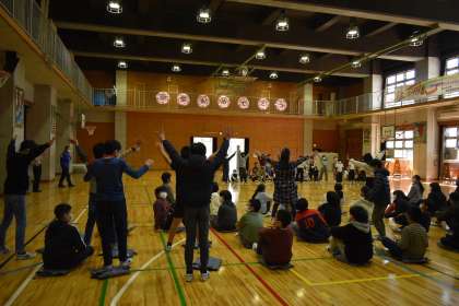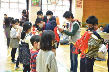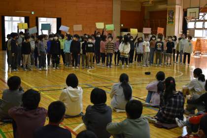 4時間目は、「6年生を送る会」でした。1〜4年生の子どもたちが、それぞれ工夫をして6年生にエールを送りました。1年生は、「鬼滅の刃」のダンスをして手作りの金メダルを6年生にプレゼントしました。2年生は、「太子堂クイズ」を出題し、答えられなかった6年生には自分たちと一緒にふりを真似してもらいました。3年生は、「勇気100%」の歌を心を込めて元気よく歌いました。