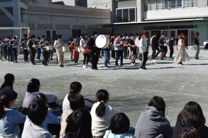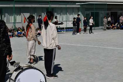 大晴天の下、1〜4年年生が見守る中、5・6年による鼓笛移譲式を実施しました。はじめに、6年生による鼓笛の最後の演奏です。