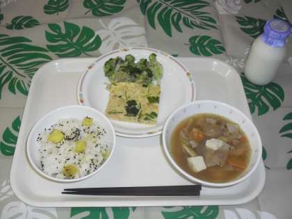 本日は秋の味覚、さつまいもをごはんに入れたさつまいもごはんです。さつまいもは1600年代に中国より沖縄に伝わり沖縄では「唐いも」と呼ばれています。沖縄からさつまいもが、鹿児島に伝わり、鹿児島では「琉球いも」と呼ばれています。でんぷんが主成分のさつまいもは加熱してもでんぷんが(糊化して)のりのようになり、ビタミンCが6割ぐらい残ります。その他ビタミンB1、カリウム、食物繊維が多いので、体の調子を整えるのに役立っています。(保健美化給食委員会 昼の放送発表より)
