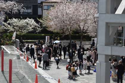 77名の新1年生が太子堂小学校に入学しました。入学式を終えて、暖かな日差しに包まれながら、晴れ晴れとした表情で記念撮影をしている姿が印象的でした。新1年生の保護者の皆様、お子様のご入学、おめでとうございます。保護者・地域の皆様、太子堂小学校に入学しました1年生をどうぞよろしくお願いいたします。