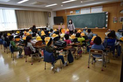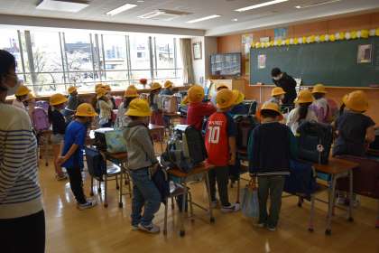 帰りの支度をして、先生の話を聞いて、「さようなら」。とても上手にできました。1年生にとっては、緊張の1週間だったと思います。ぜひ、ご家庭で「よく頑張ったね。」とたくさんほめてあげてください。来週月曜日からは、給食も始まります。お楽しみに。