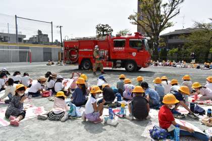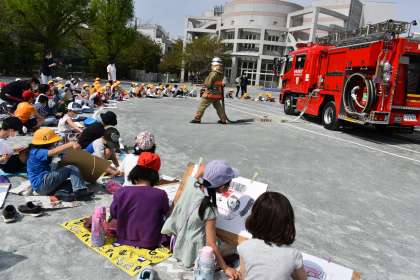 晴天に恵まれ、世田谷消防署のご協力により、「はたらく消防の写生会」を実施しました。造形的な表現力の育成に加えて、地域を守る消防の仕事への関心を高め、防災意識を育成・向上させることもねらいにしています。子どもたちは、消防自動車や消防士さんをよく見て、力いっぱいクレヨンで描いていました。そして、消防士さんに話し掛けたり、質問をしたりする様子も見られました。