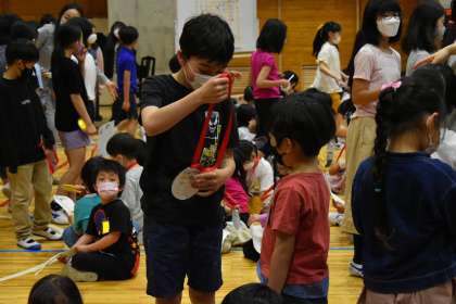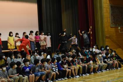4年生は、得意技で悪役を退治するという寸劇で会場を沸かせました。そして、1年生に金メダルをプレゼントしました。メダルをもらった1年生は、大喜びでした。