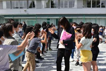 心を込めて校歌をみんなで歌いました。そして、お見送りをしました。太子堂小学校のために全力を尽くしてくださった皆様、今まで本当にありがとうございました。新しい職場でも、どうぞご活躍ください。そして、太子堂小学校の子どもたちのことをこれからも見守っていてください。