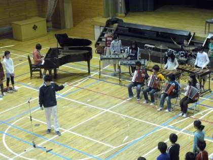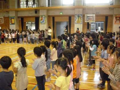 体育館で「気球に乗ってどこまでも」を合唱しました。手拍子や歌い方を学びながら最後は指揮者が感動する音楽を完成させることができました。