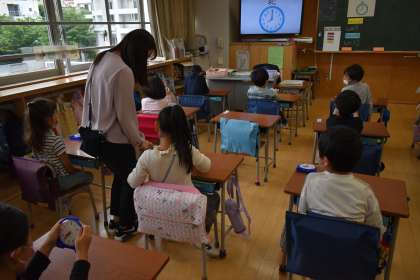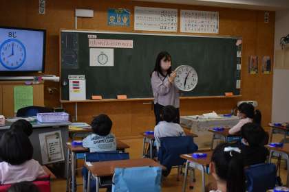 1年生算数「いまなんじ」では、○時と○時半の時計の時刻の読み方を学習しました。一人が一人が実際に時計の模型を操作して○時と○時半の時に短い針と長い針がどの位置にあるのかを確認しました。また、それぞれの時刻にはどんなことをしているかについても考えました。生活の中で時間を意識して行動できるようになるとよいですね。ぜひ、「今、何時。」と時々問い掛けて、お子様が上手に答えられたらほめてあげてください。