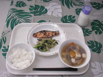 本日の給食『ごはん・鮭の南部焼き・おひたし(菊花)・豚汁・牛乳』