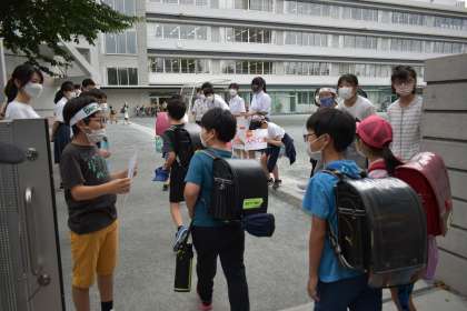 太子堂小学校で挨拶運動を実施しました。太子堂中学校の生徒の皆さんも一緒になって正門と東門に整列して登校する児童に「おはようございます。」と元気よく挨拶することができました。