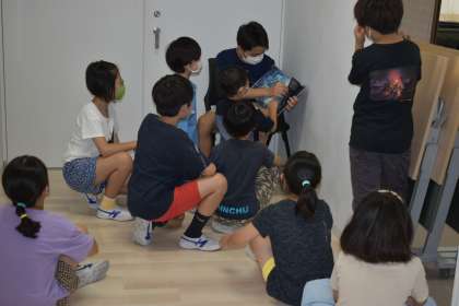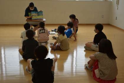 朝の時間を使って、たてわり班活動を実施しています。たてわり班ごとに活動場所に集まり、6年生が読み聞かせをしています。みんな静かに話を聞いています。