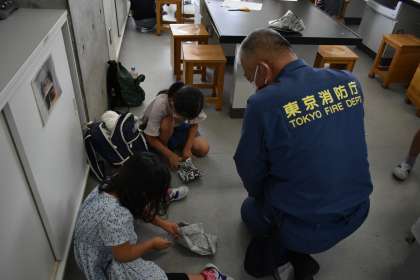 ワークショップ準備委員会が企画・運営してくださっています。講師の皆様、ありがとうございます。写真は、「消火体験をして防災グッズを作ろう!」です。ペットボトルで作ったランタンは、きらきら輝いてうっとりしました。新聞紙で靴も作ることができるのですね。
