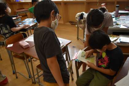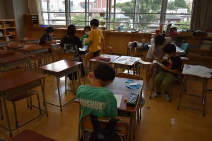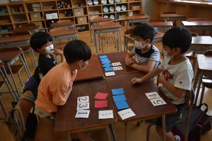 ワークショップ準備委員会が企画・運営してくださっています。講師の皆様、ありがとうございます。写真は、「算数であそぼう」です。パズルや描画、ミニゲームで遊んでいるところです。みんなよく考えて取り組んでいました。