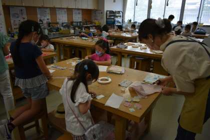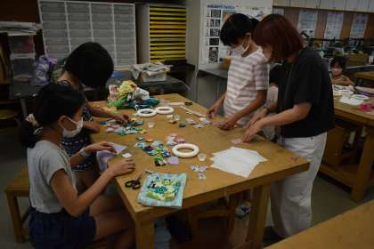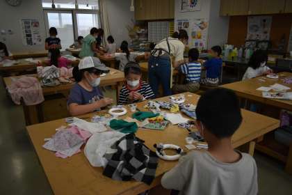ワークショップ準備委員会が企画・運営してくださっています。講師の皆様、ありがとうございます。写真は、「おうちのものを再利用☆カラフルハギレリースづくり」です。いろいろなはぎれを組み合わせて個性豊かなリースを作っていました。おうちが華やぎますね。
