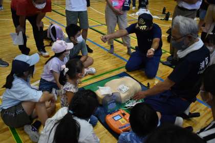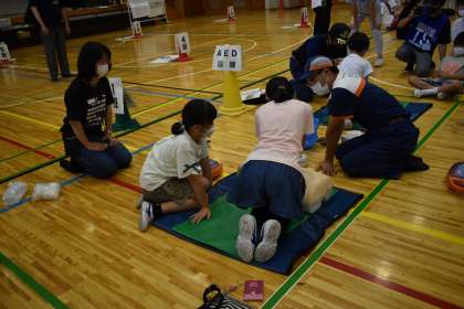 自己紹介の後、早速、訓練に入りました。写真は、心肺蘇生法の様子です。臆せず実行することが人命救助につながることを学びました。AEDの使い方も体験しました。