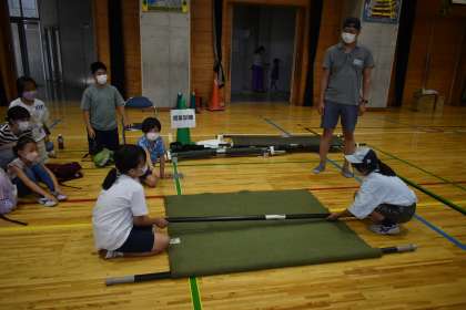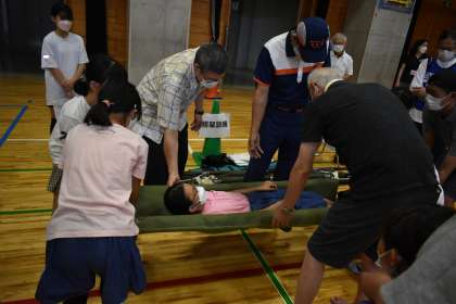 搬送訓練をしました。2本の棒に毛布を折り重ねて担架を作りました。実際に担架に乗せて運ぶ体験もしました。椅子に乗せて運ぶこともできます。いろいろなものを担架の代わりにすることができると知りました。