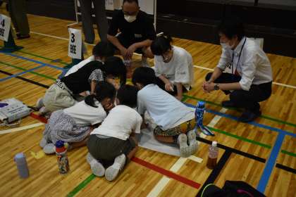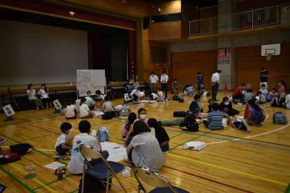 グループ討議をしました。課題は、2つです。1つは、大震災を想定したとき、街の中で危険だと思われる場所と理由。もう1つは、大震災の後、避難所生活をすることになったらどんなお手伝いができるかです。中学生のリーダー・副リーダーが中心になって話し合いを進めていました。