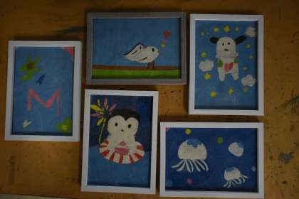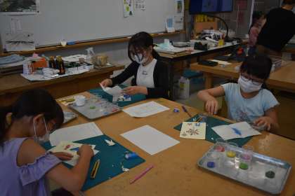 ワークショップ準備委員会が企画・運営してくださっています。講師の皆様、ありがとうございます。写真は、「たのしい 砂絵入門☆」です。ハガキ大の粘着シートに色砂を貼り付けて作成します。カッターも上手に使っていました。額に入れたら完成です!
