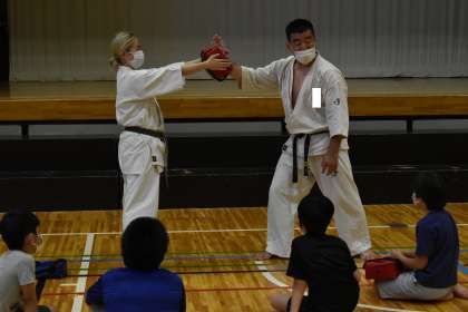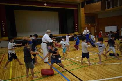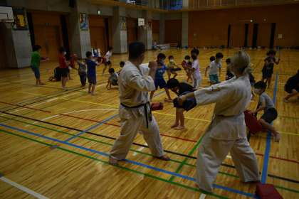 ワークショップ準備委員会が企画・運営してくださっています。講師の皆様、ありがとうございます。写真は、「押忍!空手の技で板を割ってみよう!」です。先生方のご指導のもと、みんなかっこよく手足を使って技を決めていました。見ているだけですかっとしますした。