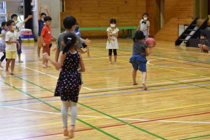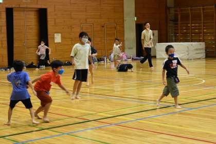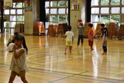 ワークショップ準備委員会が企画・運営してくださっています。講師の皆様、ありがとうございます。写真は、「からだを使ってあそぼう」です。暑くても、みんな元気いっぱい!体育館のすみずみまで走り回ったり、ドッジボールをしたり、たくさん体を動かしました。夏休みの間も、運動して汗をかいて、丈夫な体を作りましょうね。
