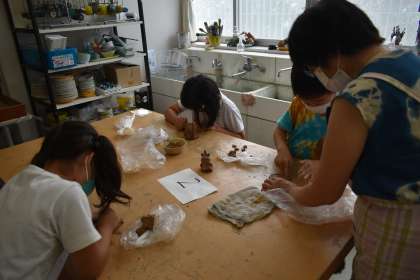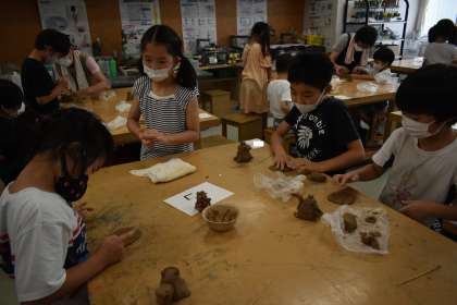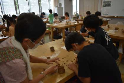 ワークショップ準備委員会が企画・運営してくださっています。講師の皆様、ありがとうございます。写真は、「シーサーを作ろう」低学年の部です。個性豊かなシーサーがあちらこちらに。焼き上がりが楽しみですね。
