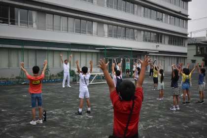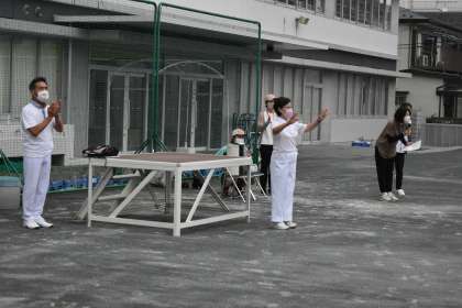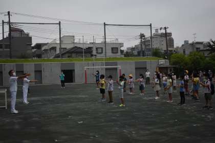 ラジオ体操 第1日目です。世田谷区ラジオ体操連盟のお2人に、5日間、ご指導をいただきます。ご紹介の後、早速、体操が始まりました。