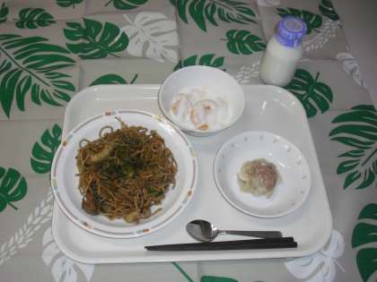 本日のメニューは、ソース焼きそば、ジャンボしゅうまい、フルーツヨーグルト、牛乳です。