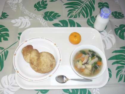 今日のメニューは、揚げパン(きなこ)、白菜と肉団子のスープ、みかん、牛乳です。