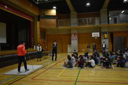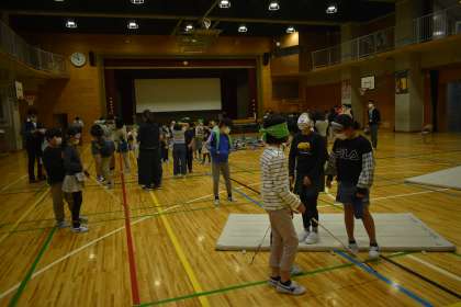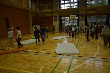 4年生は、木村選手との交流を通して、さらに障害についての理解を深めるためにクラスごとに2つの体験をしました。1つは、1人がアイマスクを着用し白杖を持ち、もう1人が補助をしたり、誘導をしたりして歩く体験です。
