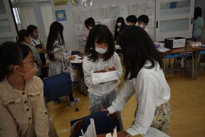 今日は、待ちに待ったおもちゃフェスティバル。学年全体で各学級で作ったおもちゃを使ってのゲームを楽しみました。前半・後半交替制で、ゲーム屋さんになってお客さんを集めたり、ルールを説明したり、お客さんになってルールを守って遊んだりしていました。「こわれたら自分で直してくださいね。」とお店の人が言うと、「それは、お店の人がすることではないですか。」とお客さん。「すみません。」と丁重に謝るお店屋さん様子から、それぞれの役になりきっていることが分かりました。