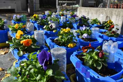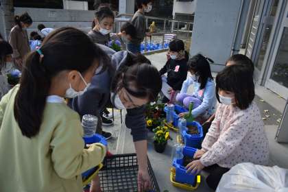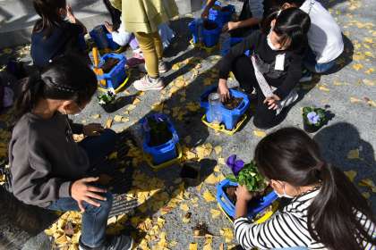 1年生は、生活科の時間にチューリップの球根とパンジーの苗を植木鉢に植えました。チューリップの球根とパンジーの苗は、昨年度に続き、東京都都市緑化基金からいただきました。大切に育ててほしいです。