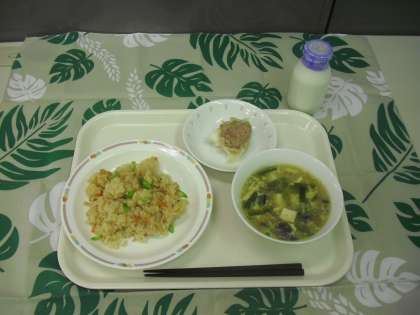 本日のメニュー『中華おこわ・にら玉スープ・ジャンボしゅうまい・牛乳』